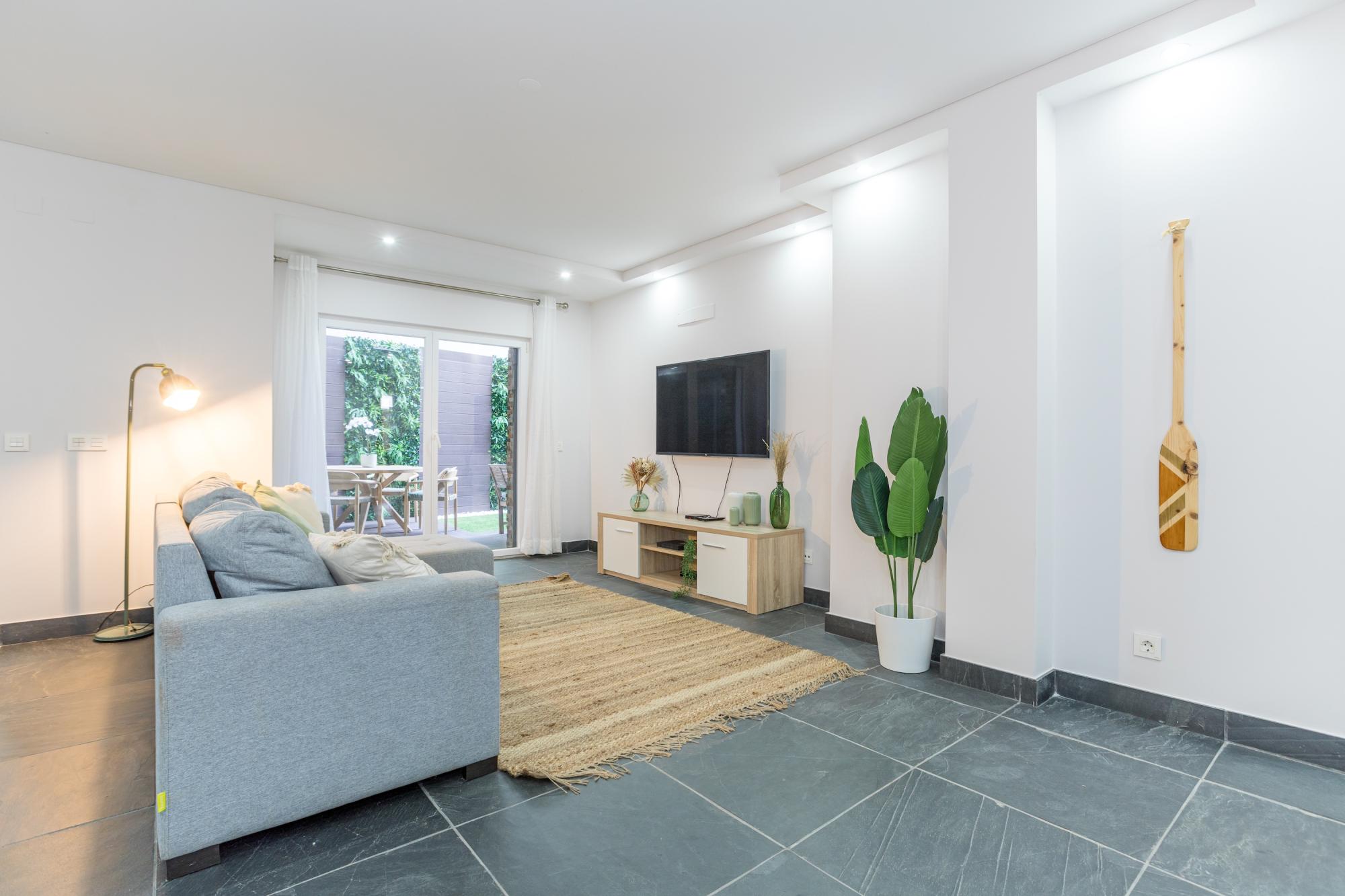 El salón dispone de un sofá (que se convierte en sofá cama), TV de pantalla plana, Wi-Fi y mesa de comedor y sillas para 6 personas.